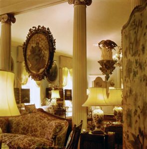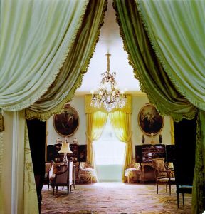 اتاق پذیرایی این خانه؛ از میان درگاه پردهدار دیده میشود، پردههای زرد پنجرهها را قاب گرفتهاند. یک لوستر کریستالی از Maison Bagues در مرکز اتاق آویزان است. یک فرش بزرگ بافتهشده قرن هجدهمی از برند Savonnerie بخش زیادی از کف را پوشانده است. در دو طرف یکی از پنجرهها، نقاشی بیضیشکل به سبک روکوکو با عنوان «فصل» از مکتب نیکولاس لانکره قرار دارد. در زیر هر نقاشی، یک کمد زرشکی و روی میز لویی چهاردهم، در کنار یک صندلی کمپشت با کوسنهای گلدوزیشدهی سفید، قرار دارد. صندلیهای راحتی قرن نوزدهمی روی فرش را ببینید (به نظر چندان راحت نیستند).