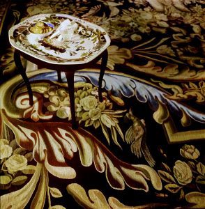 یک فرش در اتاق مطالعه. این فرش، از کارگاههای ملیلهدوزی آوبوسون در منطقه کروز فرانسه، با گلها، تاکها و پرندگان باروک بر روی زمینه سیاه بافته شده است. روی فرش یک میز کوچک قرار دادهاند که روی آن با گلها و تاکهای باروک بر روی زمینه سفید نقاشی شده است.
