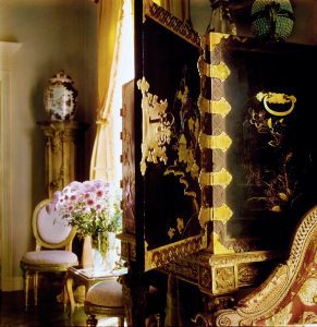 کمد سبک چین لاکی مشکی که با طرحها و گلهای طلایی رنگآمیزی شده را میبینید. در دو طرف پنجرهی کنار کمد، دو صندلی طلاکاری شده، با پشتی بیضی شکل و روکش صورتی از کاخ تویلری، که قبلاً در پاریس بوده، قرار دارد. در گوشه، یک کوزهی چینی روی یک پایهی بلند باروک قرار داده اند.