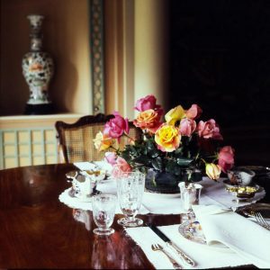 یک دسته گل رز زرد و صورتی در مرکز تصویر، روی یک دستمال سفره گرد از جنس کتان سفید با لبههای صدفی قرار گرفته و اطراف آن را پارچهای کوچک سیلور و ظروف چینی و کریستالی احاطه کردهاند. در پسزمینه، یک گلدان چینی بلند در طاقچهای دیواری قرار دارد.