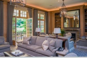 در عکس اول، او را در اتاق نشیمن خانهاش در ساوتهمپتون، نیویورک میبینید که روی مبلی با گلدوزیهای طلایی و سفید نشسته و لباسی طلایی با تاپ پولکدوزی شده و دامنی تمام ساتن به تن دارد. نگاه کنید دیوارها با گچبری به سبک ویکتوریایی تزیین شدهاند.